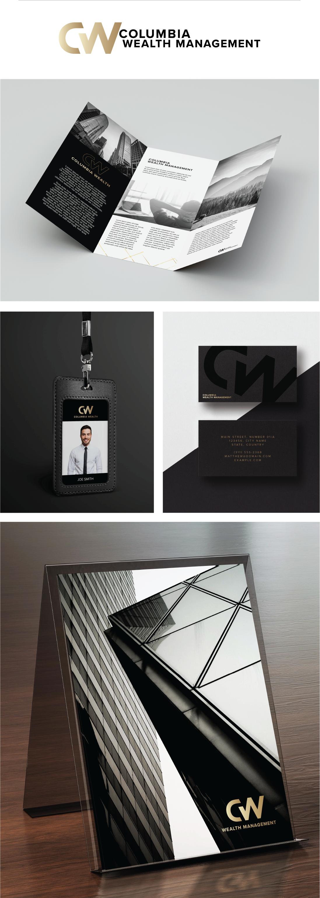 Redesign proposal for Columbia Wealth Management flyers, badge and business cards.